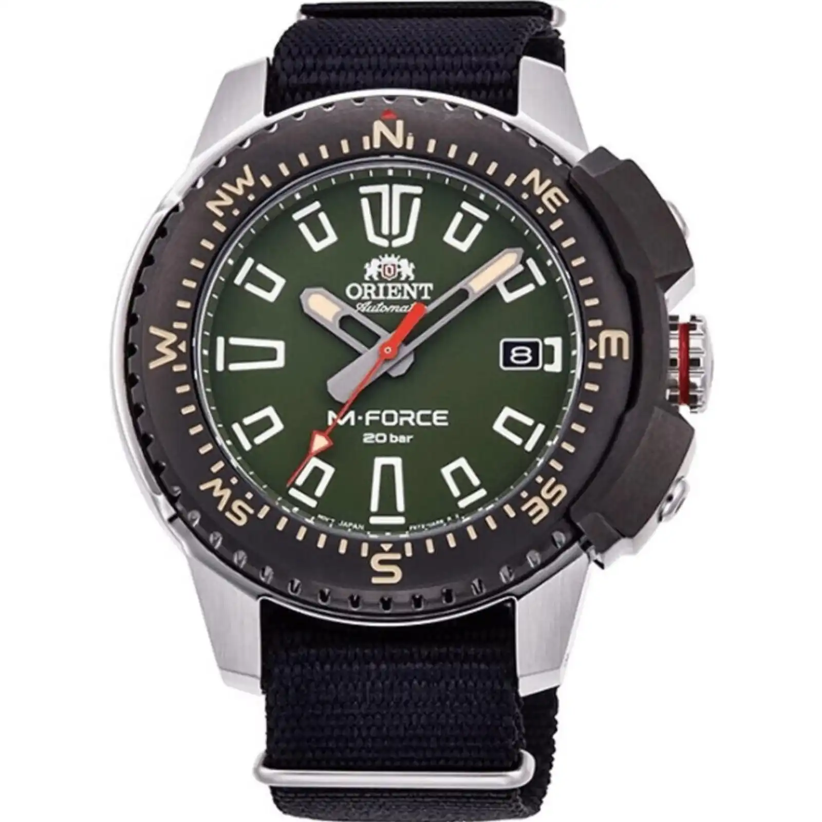 Stainless Steel Case Nylon Strap Automatic Movement Caliber: F6727 Sapphire Crystal Green Dial Analog Display Power Reserve Luminous Hands Date Display Bi Directional Rotating Bezel Screw Down Crown Screwed Case Back Buckle Clasp 200m Water Resistance