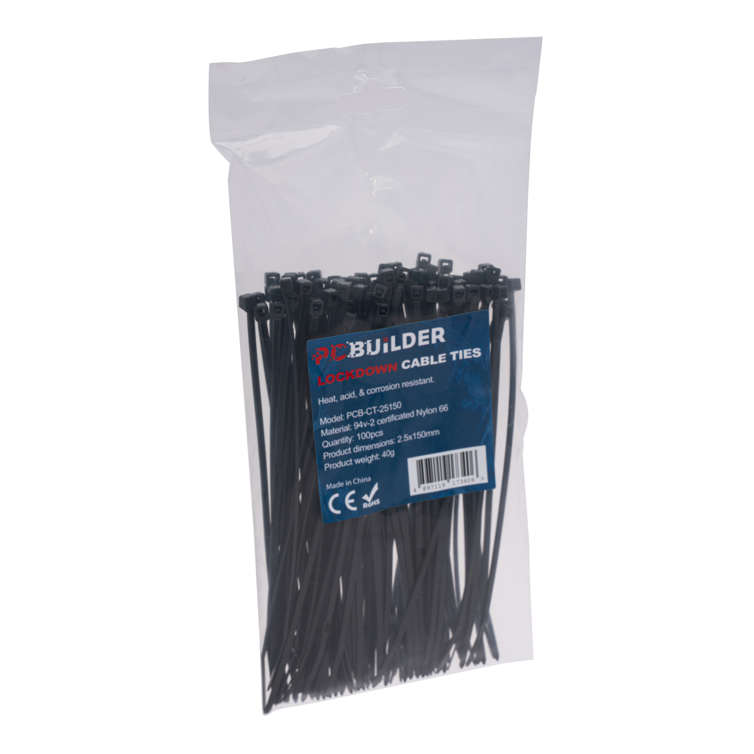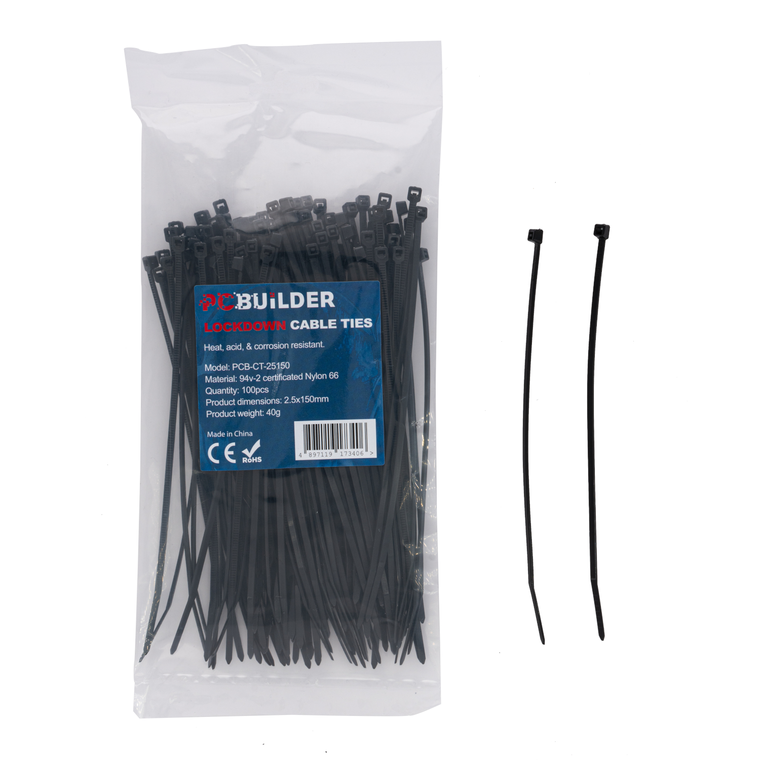 Understanding the need for both quality and quantity, each pack of PCBuilder LOCKDOWN cable ties provides 100 pieces. This ensures that you have a substantial supply to complete multiple projects or to keep a ready stock for future needs. The total weight of just 40g for the pack means they are easily stored and transported without adding significant bulk. This thoughtful packaging reflects a consideration for the user’s convenience and project scope, allowing for uninterrupted workflow and assured completion.