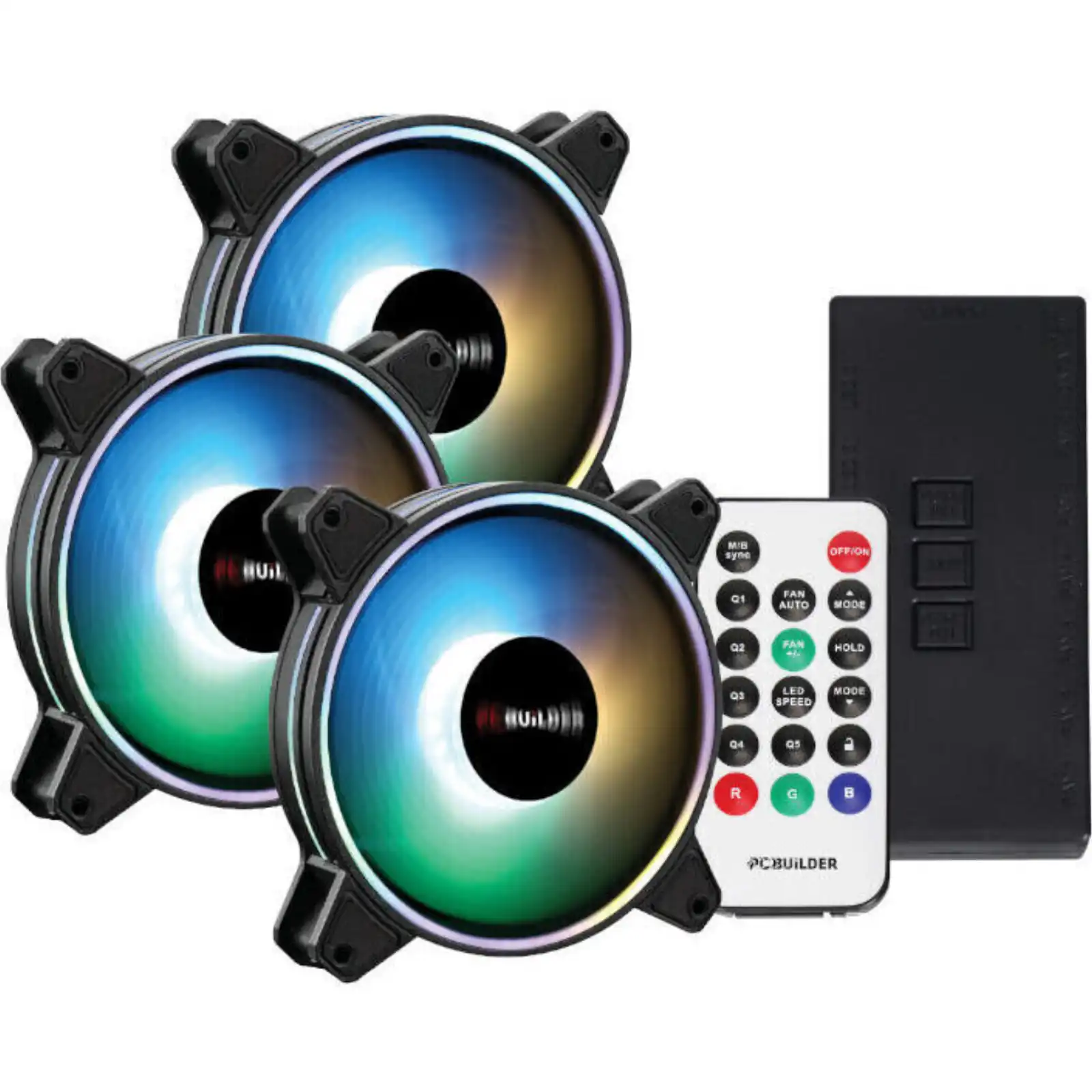 The PCBuilder TEMPEST CHILL ARGB Dual Glow Fan Kit comprises of 3 x 120mm Dual Glow ARGB Fans, an ARGB hub, and an RF fan remote control. These fans are designed to keep your PC cool during the most intense gaming sessions by pumping air at up to 1200 RPM. This means your PC can maintain optimal temperatures during extended sessions. The LEDs are positioned on the outer & inner fan which ensures simultaneous, vibrant ARGB glow & lighting ring effects.