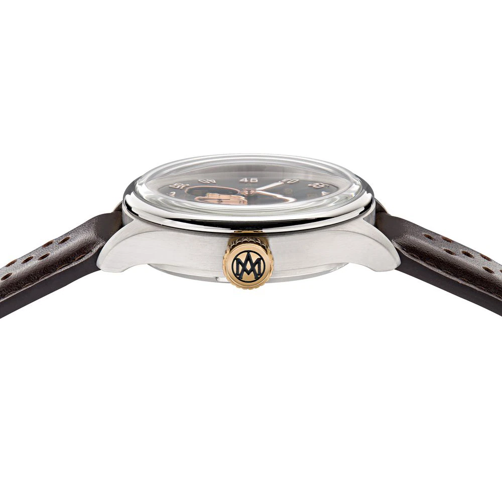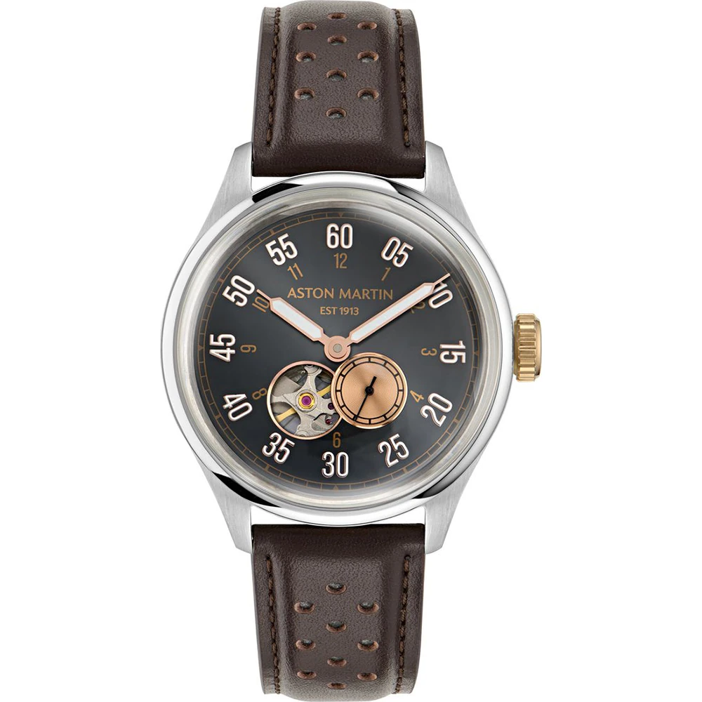 Aston Martin Timeless TS1 Automatic MTTS1F501 – 41mm Recycled Stainless Steel Watch with Skeletonized Black Dial and Brown Patterned Leather Strap