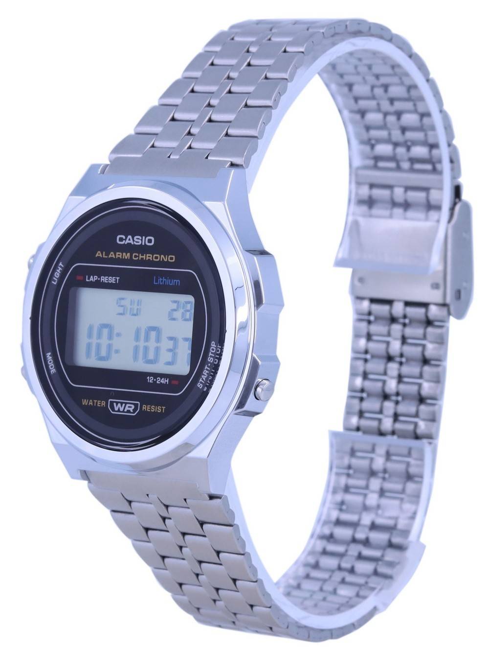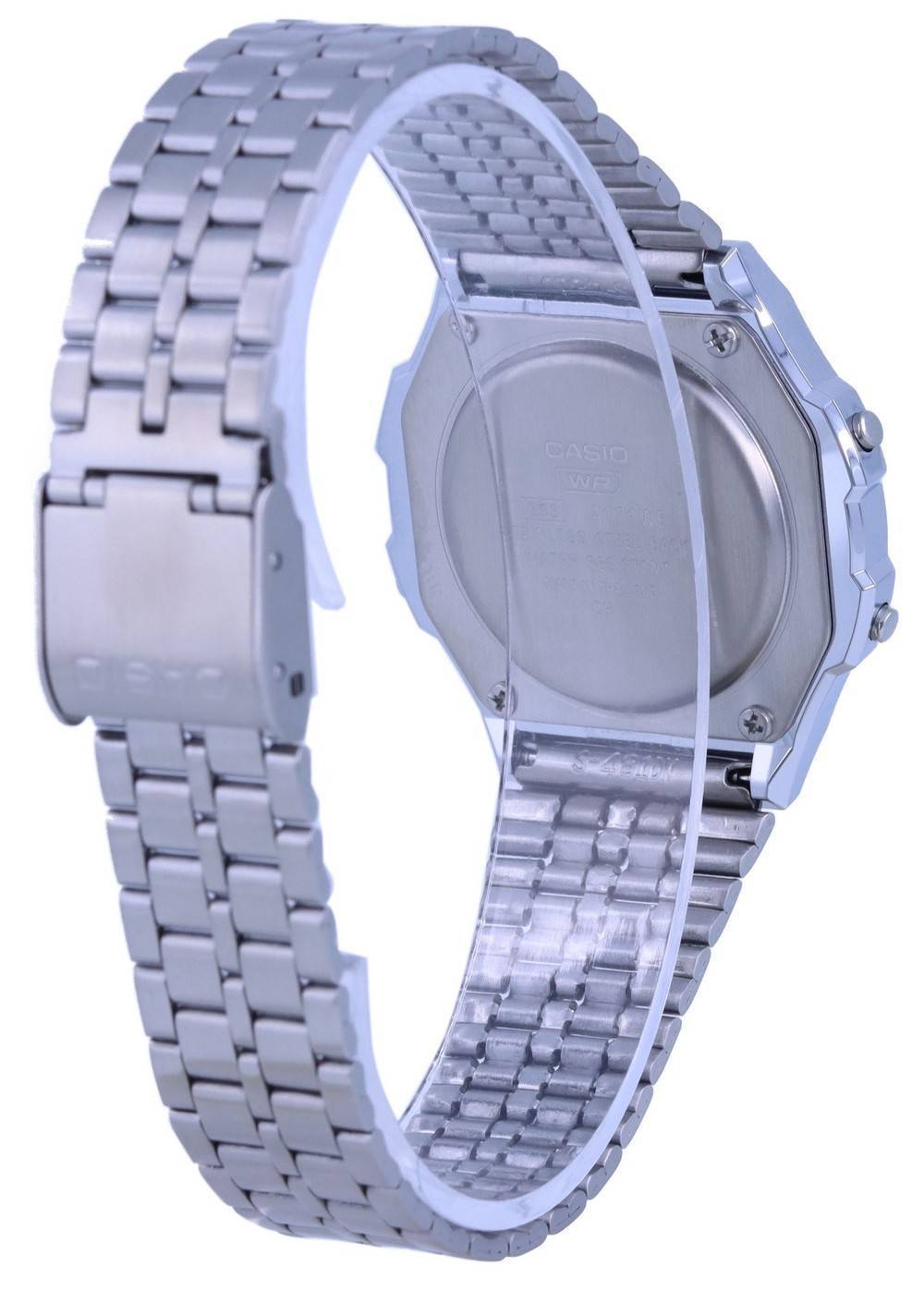 Resin Case Stainless Steel Bracelet Resin Crystal Digital Display LED light 1/100-Second stopwatch Daily Alarm Hourly Time Signal Auto Calendar 12/24 Hour Display Day And Date Display Solid Case Back Deployment Clasp Splash Resistance