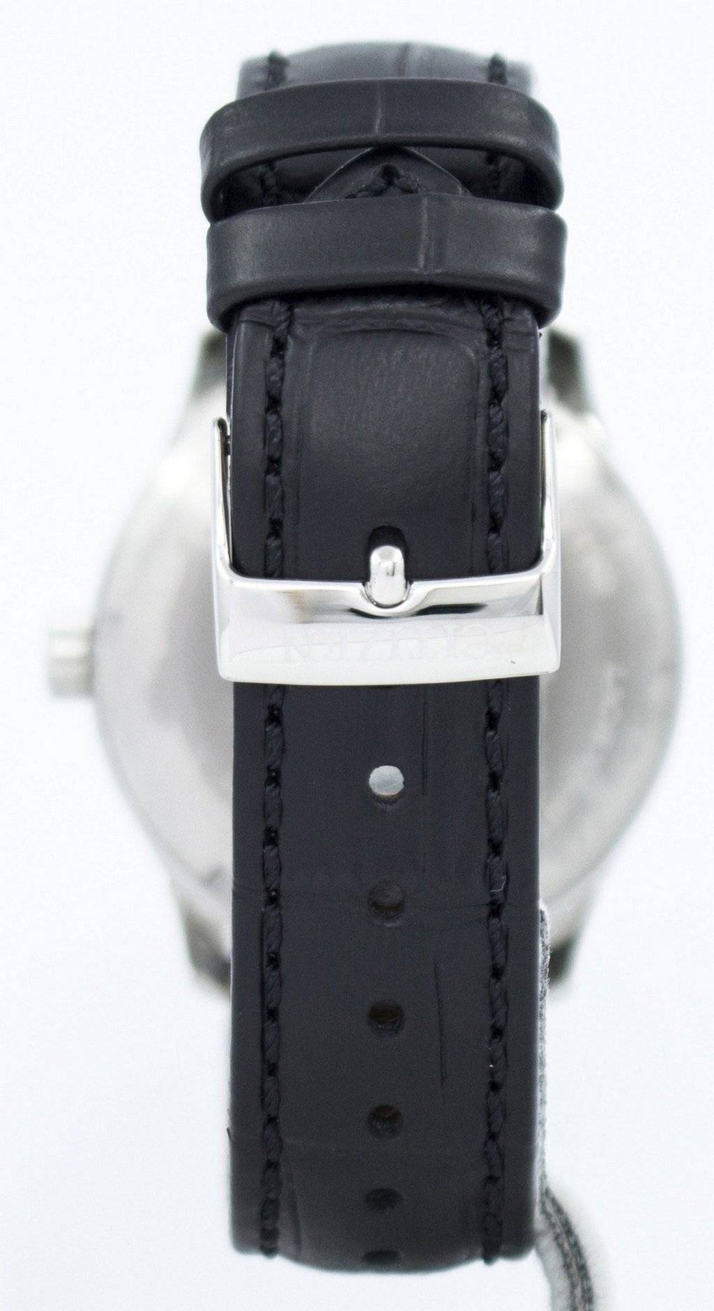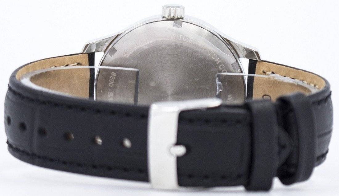 Stainless Steel Case Black Leather Strap Automatic Movement Caliber: 8200 Mineral Crystal Black Dial Silver Tone Hands And Markers Day And Date Display Pull/Pull Crown Solid Case Back Buckle Clasp 50M Water Resistance