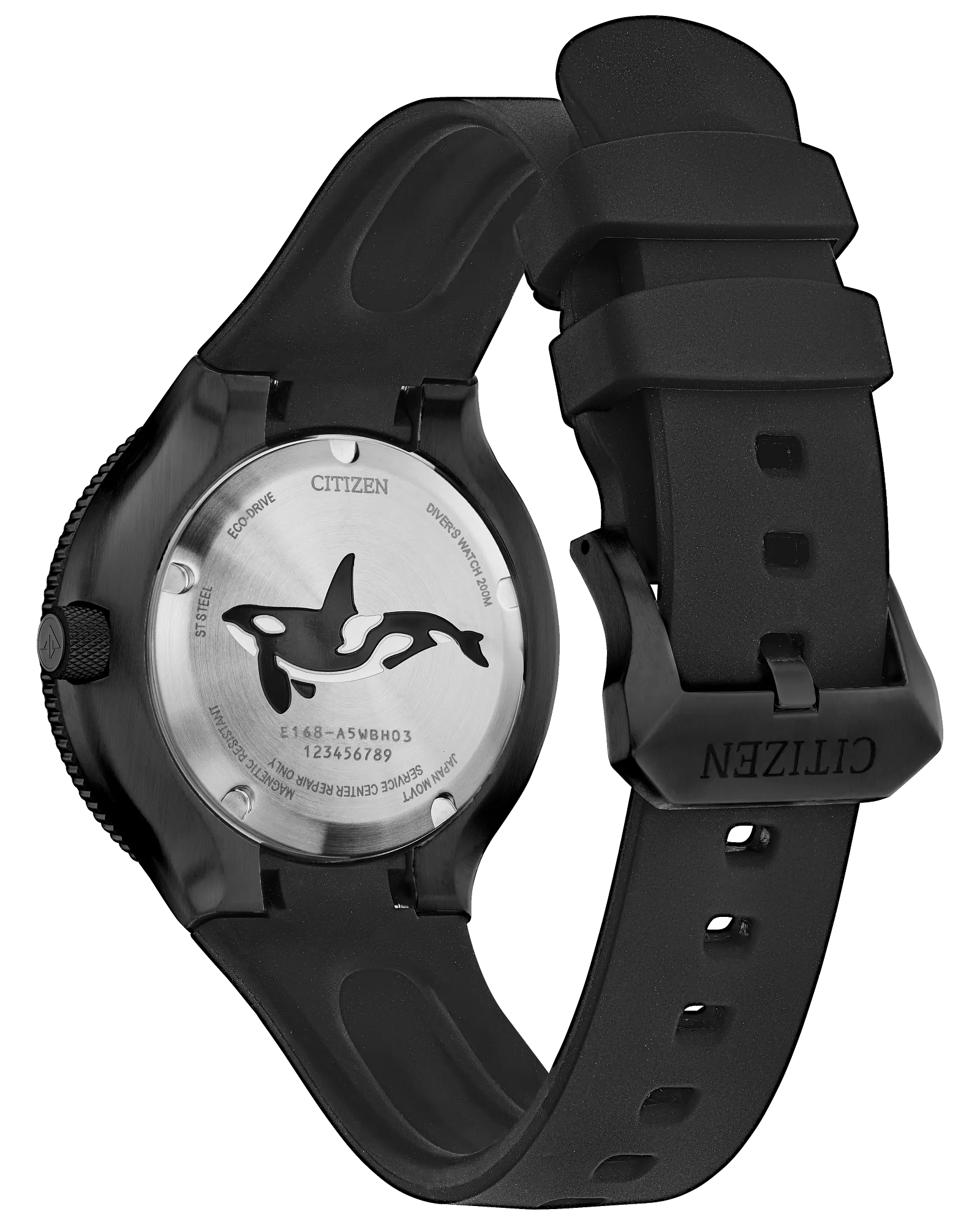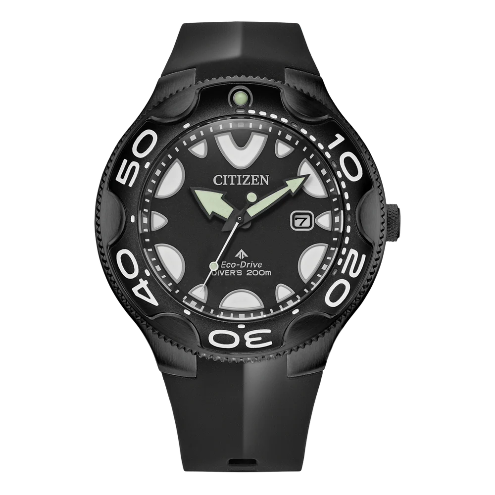 Stainless Steel Case Polyurethane Strap Eco-Drive Movement Caliber: E168 Mineral Crystal Black Dial Analog Display Power Reserve Upto 6 Months Low Charge Indicator Luminous Hands And Markers Date Display Uni Directional Rotating Bezel Screw Down Crown Screwed Case Back Buckle Clasp 200M Water Resistance