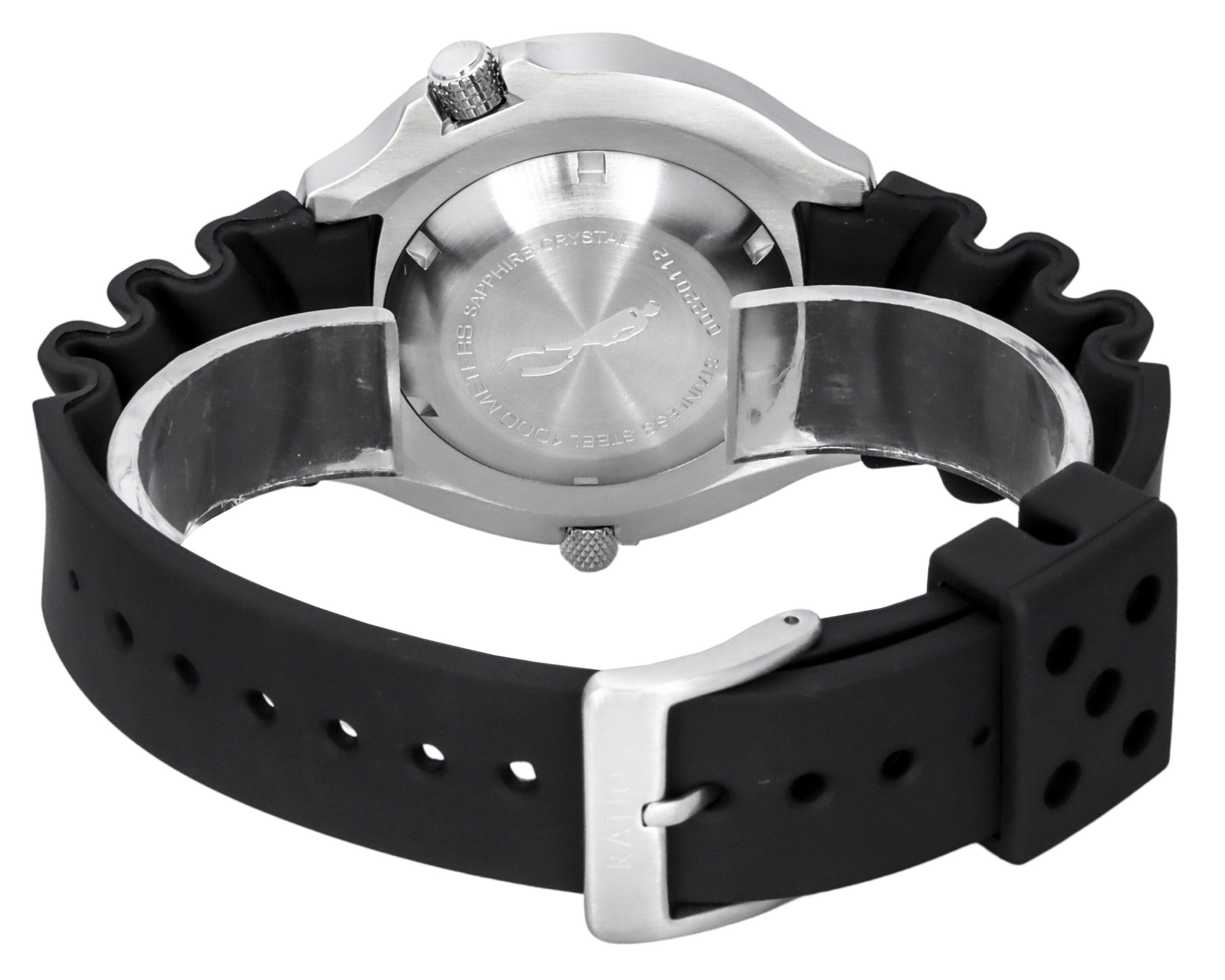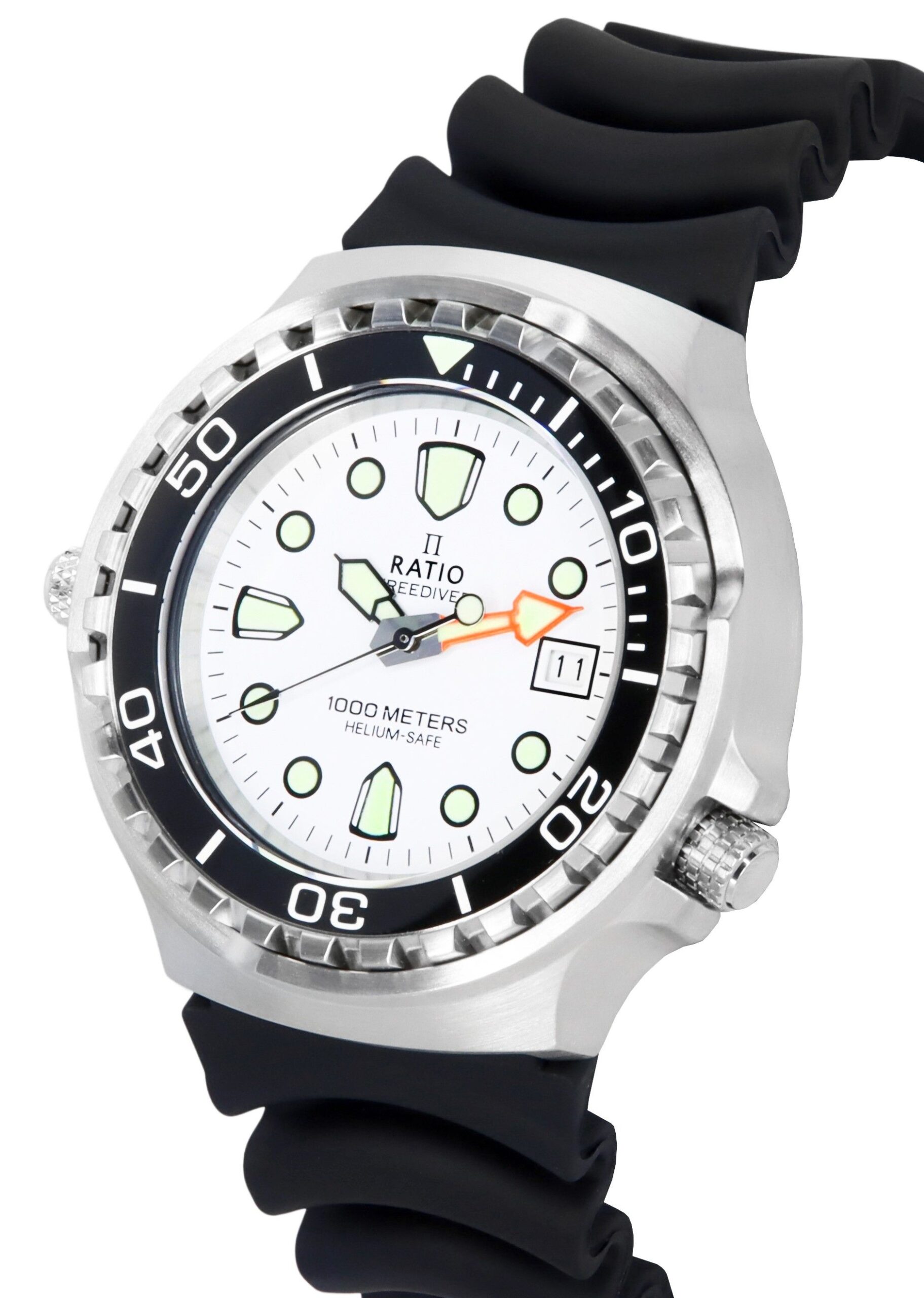Stainless Steel Case PU Strap Quartz Movement Caliber: VX42E Sapphire Crystal White Dial With Logo “RATIO” Analog Display Bezel With Ceramic Inlay Helium Valve Luminous Hands And Markers Date Display Screw Down Crown Engraved Caseback (With Image Of A Free Diver) Buckle Clasp 1000M Water Resistance