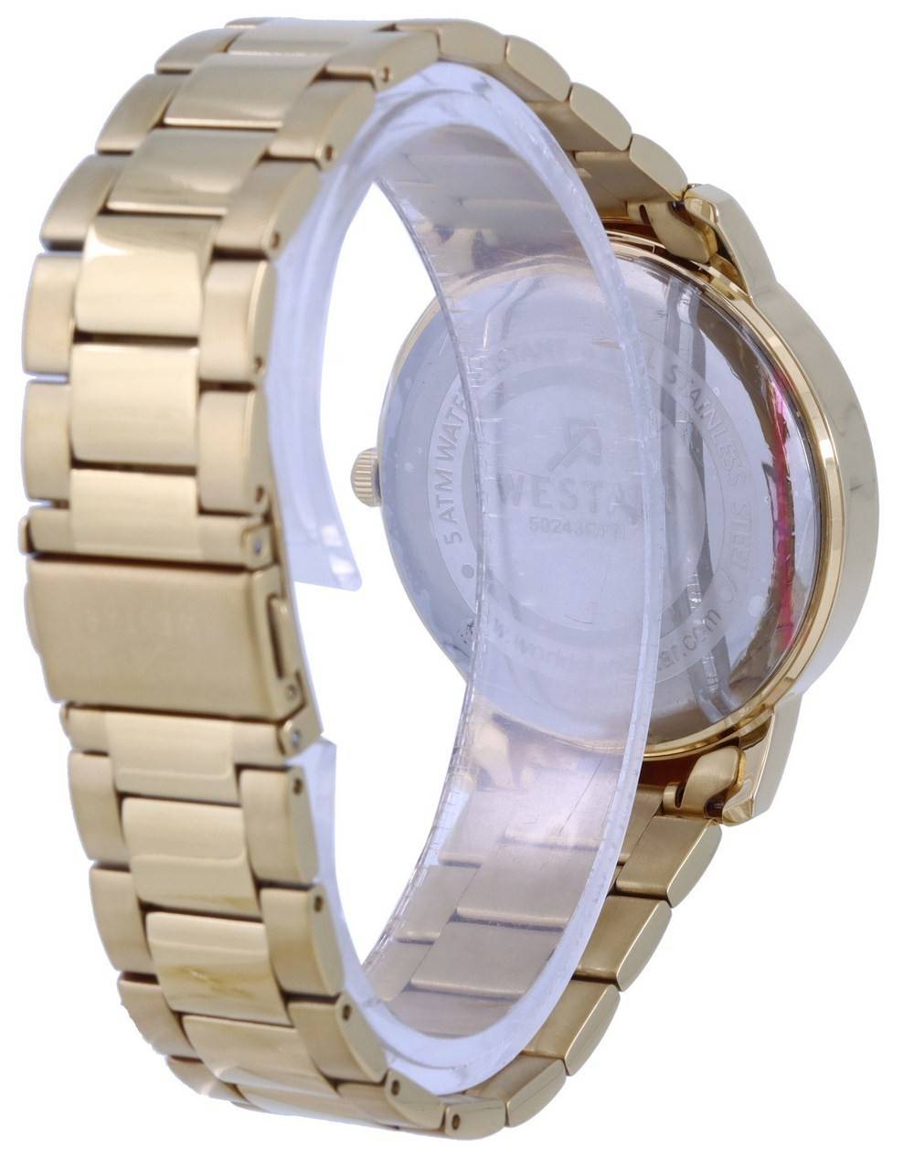 Gold Tone Stainless Steel Case Gold Tone Stainless Steel Bracelet Quartz Movement Mineral Crystal Silver Dial Analog Display Date Display Solid Case Back Deployment Clasp 50m Water Resistance