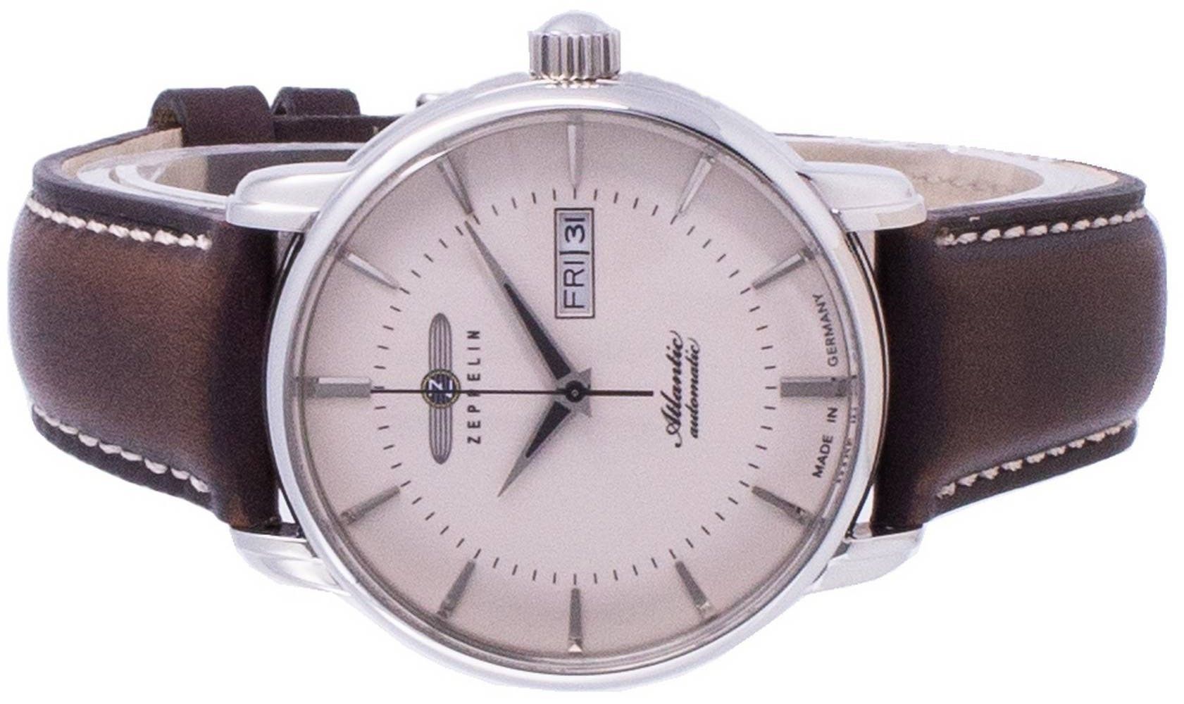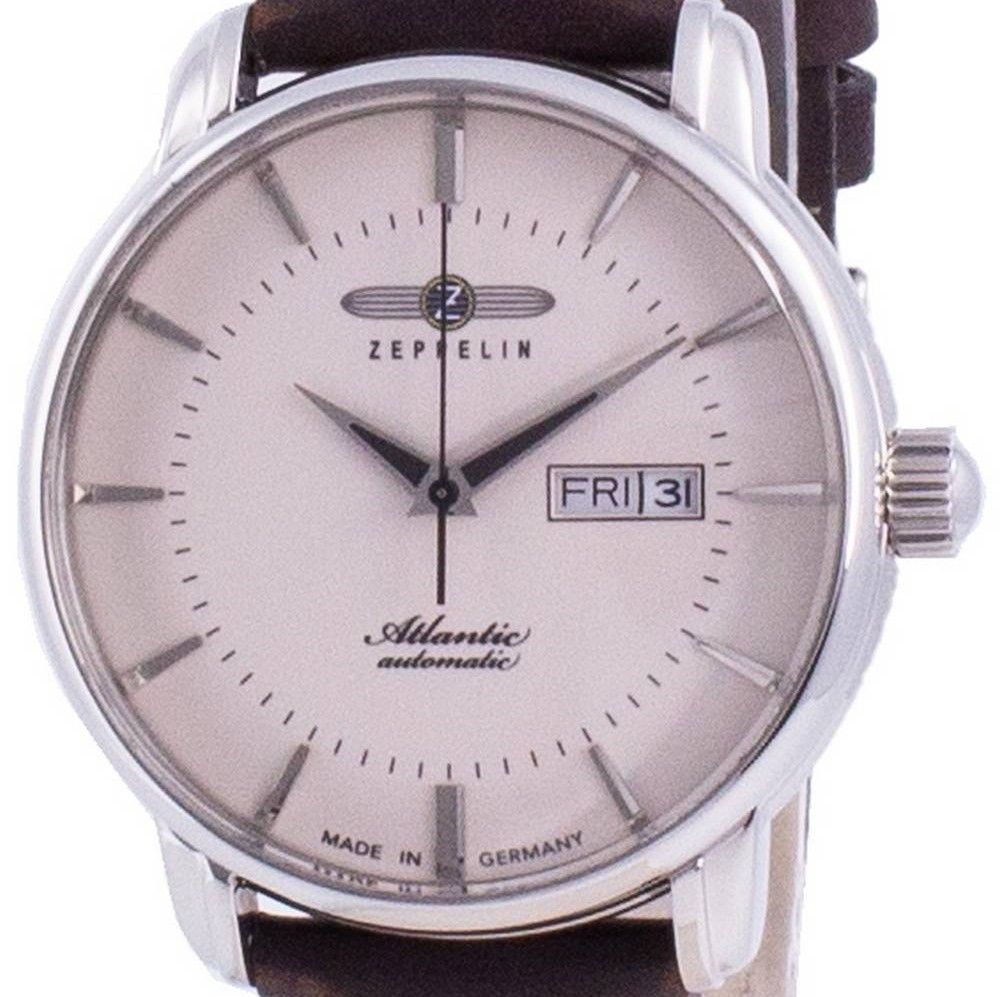 Stainless Steel Case Leather Strap Automatic Movement Caliber: 8205 21 Jewels Mineral Crystal Beige Dial Analog Display Day And Date Display See Through Case Back Buckle Clasp 50M Water Resistance
