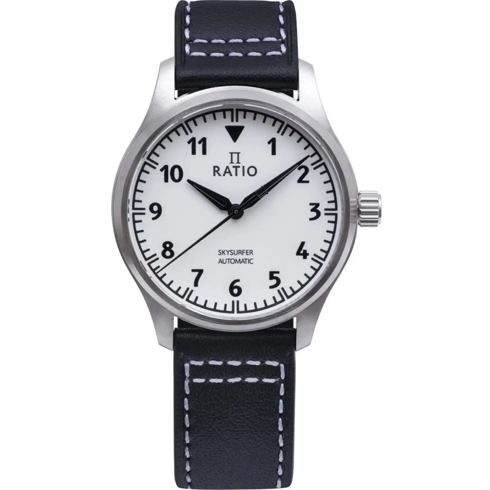 Stainless Steel Case Genuine Leather Strap Automatic Movement Caliber: NH38A Power Reserve Up To 40 Hours Sapphire Crystal Full Luminous Dial With Logo “RATIO” Analog Display Screw Down Engraved Crown Engraved Case Back (With Image Of A Skysurfer) Engraved Buckle and Clasp 200m Water Resistance
