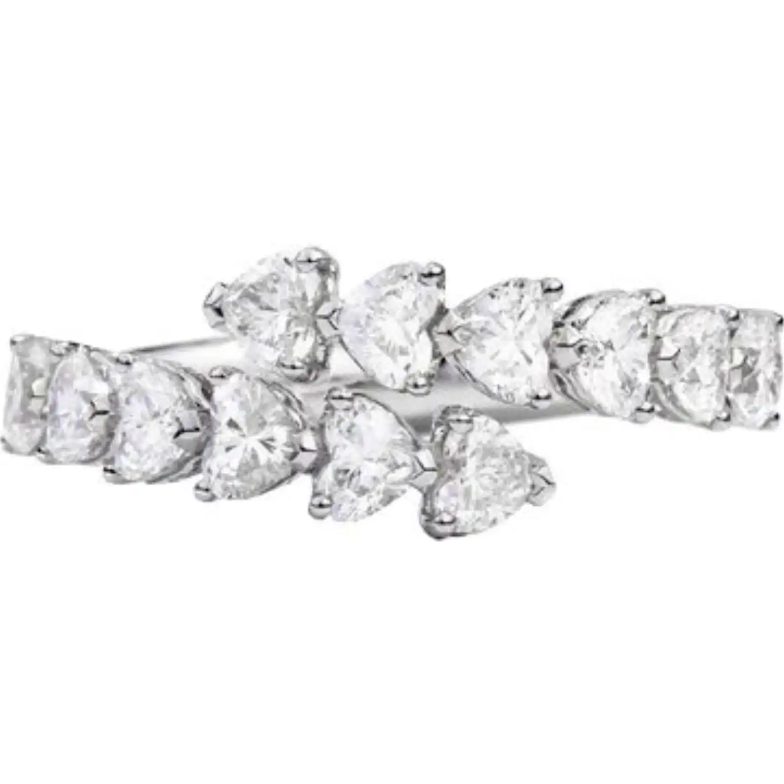 The “Contrarié” style, also known as a bypass ring, features two ends of the band that wrap around the finger to meet in a graceful, interlocking embrace. This design is highly symbolic in bridal and anniversary jewellery, representing two lives coming together while maintaining their individual brilliance. In this specific Recarlo iteration, the 18kt white gold band flows with a fluid, liquid-like quality, leading the eye directly to the twin heart-cut diamonds that appear to float upon the finger.
