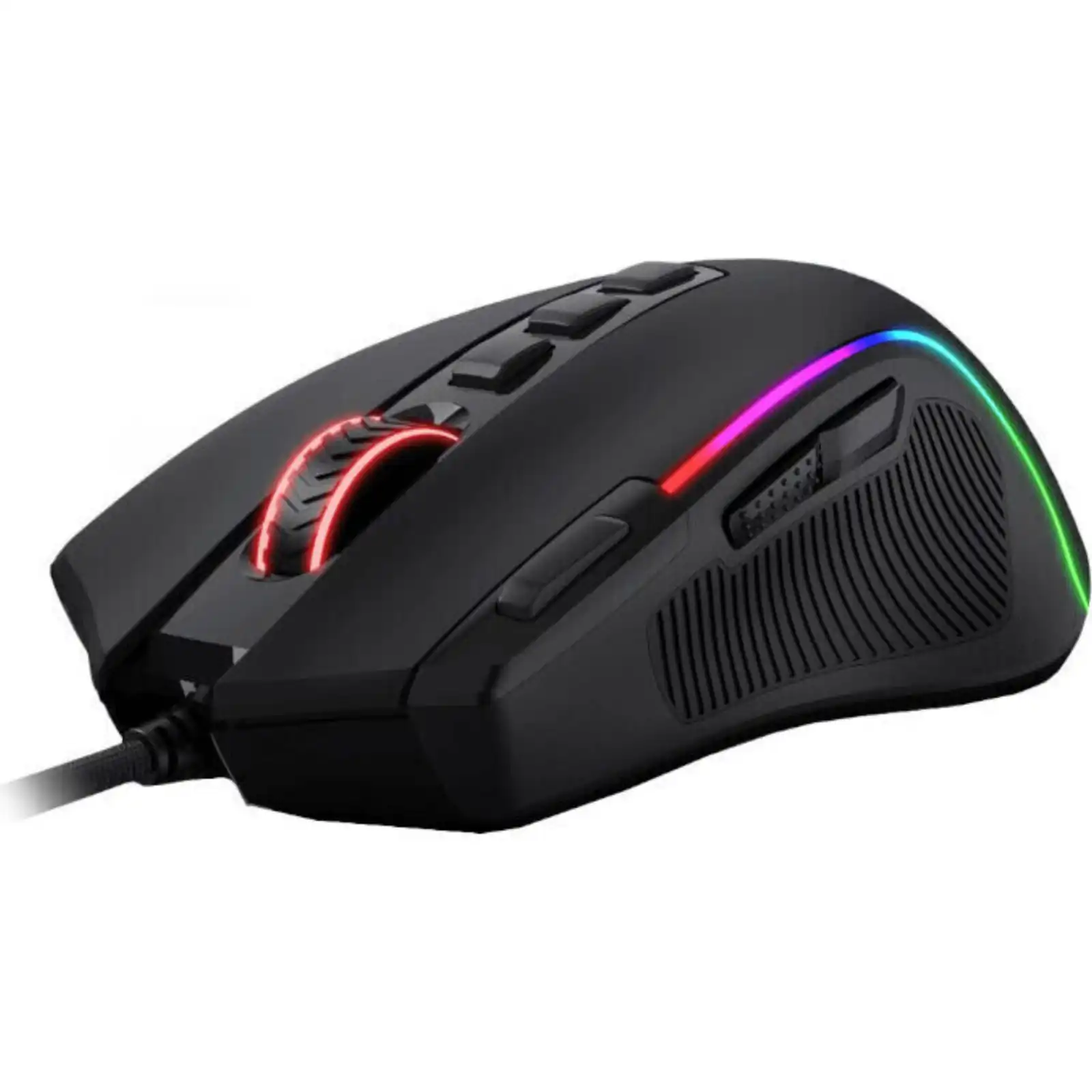 The Redragon M612 Predator Wired RGB Gaming Mouse is a 4000 DPI optical gaming mouse with 11 programmable buttons and 5 backlit LED modes. Geared with 5 adjustable DPI levels (by default 500/1000/2000/3000/4000), making it is easy to switch between different game needs. The buttons are fully programmable with software and the DPI can be upgraded up to 8000 with a software update as well. It also has 1 rapid-fire and 2 side macro buttons to offer you better gaming or working experience. The skin-friendly frosted coating you a comfortable grip on the mouse surface, which offers you the most enjoyable fingerprint-free tactility. The left side is equipped with a rubber texture to strengthen the friction and make the mouse easier to control.