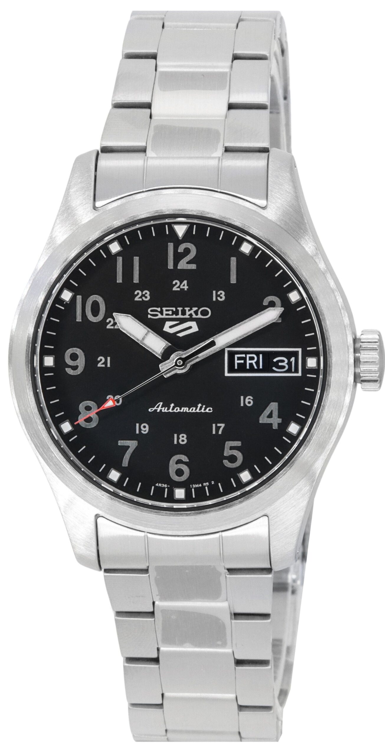 Features: Stainless Steel Case Stainless Steel Bracelet Automatic Movement Caliber: 4R36 24 Jewels Curved Hardlex Crystal Black Dial Analog Display Power Reserve Up To 41 Hours Luminous Hands And Markers Day And Date Display Pull Out Crown See Through Case Back Deployment Clasp 100m Water Resistance Approximate Case Diameter: 36.4mm Approximate Case Thickness: 12.5mm Approximate Lug Width : 18mm