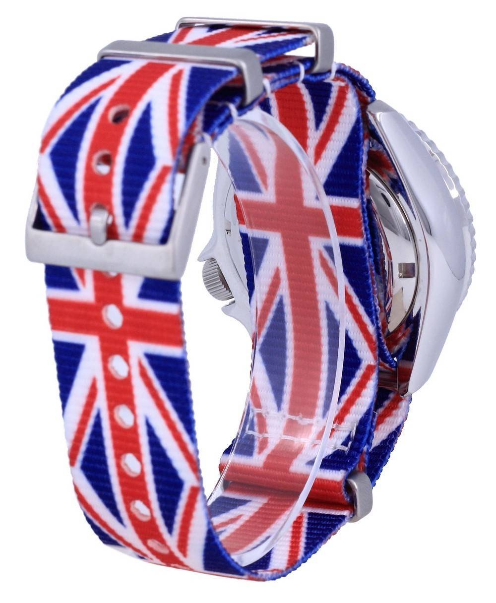 Made In Japan Stainless Steel Case Polyester United Kingdom National Flag Pattern Strap Automatic Movement Caliber: 7S26 21 Jewels Hardlex Crystal Blue Dial Analog Display Luminous Hands And Markers Day And Date Display Unidirectional Rotating Bezel Screw Down Crown Screwed Case Back Buckle Clasp 200m Water Resistance