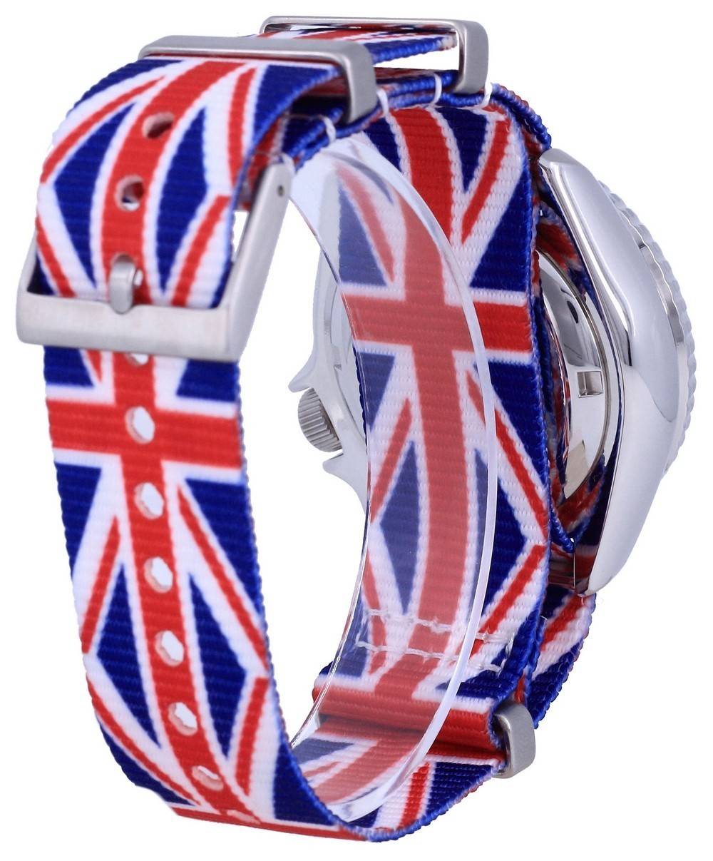 Stainless Steel Case Polyester United Kingdom National Flag Pattern Strap Automatic Movement Caliber: 7S26 21 Jewels Hardlex Crystal Blue Dial Analog Display Luminous Hands And Markers Day And Date Display Unidirectional Rotating Bezel Screw Down Crown Screwed Case Back Buckle Clasp 200m Water Resistance
