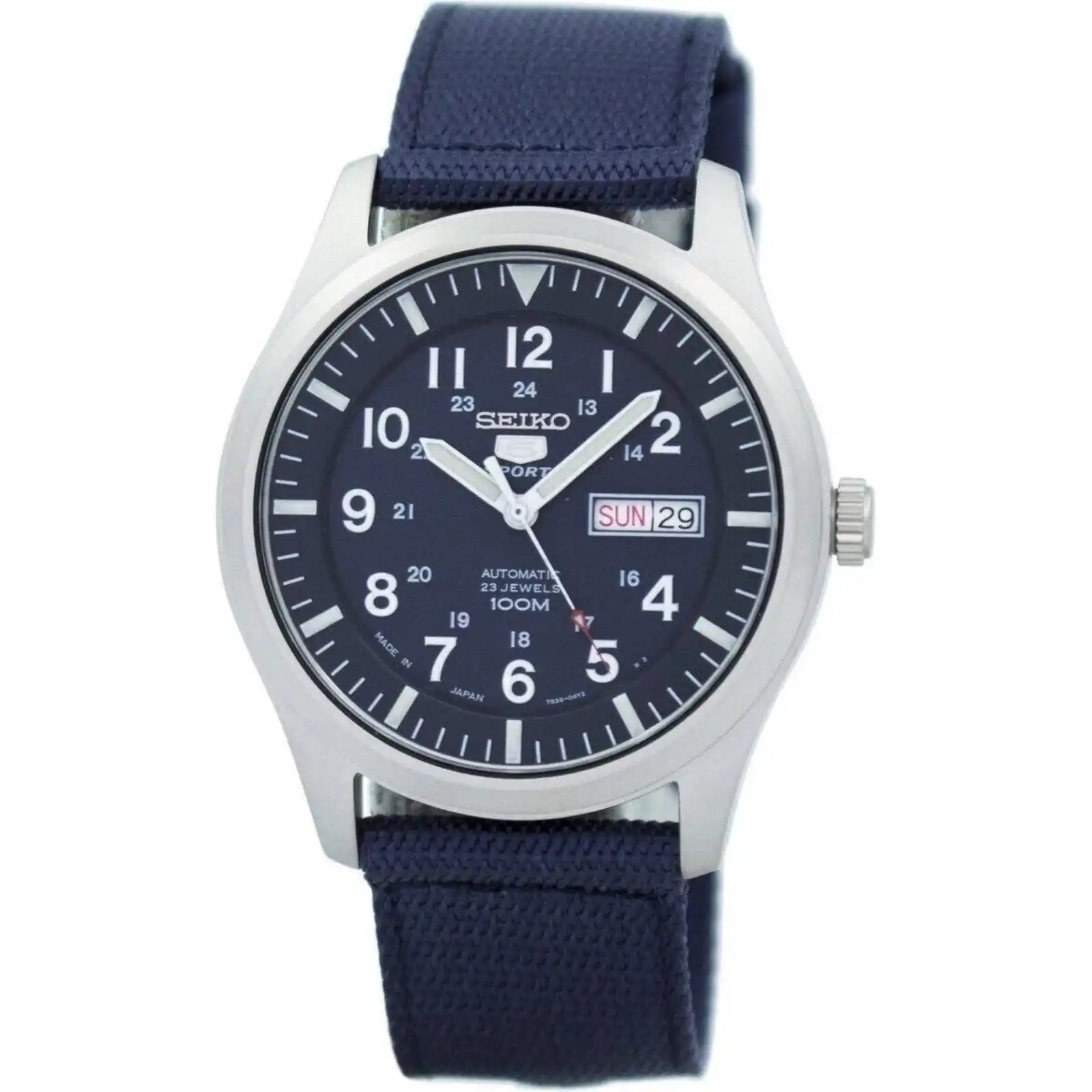 Made In Japan Stainless Steel Case Nylon Strap Automatic Movement Caliber: 7S36 Hardlex Crystal 23 Jewels Blue Dial Analog Display Luminous Hands And Markers Day And Date Display See Through Case Back Pull/Push Crown Buckle Clasp 100M Water Resistance