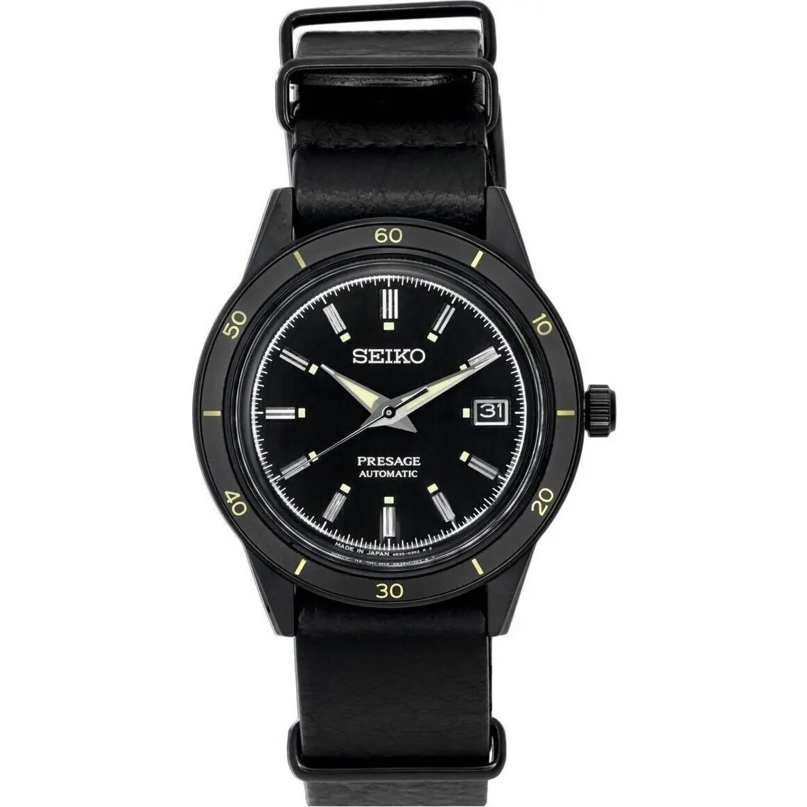 Stainless Steel Case Leather Strap Automatic Movement Caliber: 4R35 23 Jewels Box Shaped Hardlex Crystal Black Dial Analog Display Power Reserve Upto 41 Hours Luminous Hands And Markers Date Display See Through Case Back Buckle Clasp 50m Water Resistance