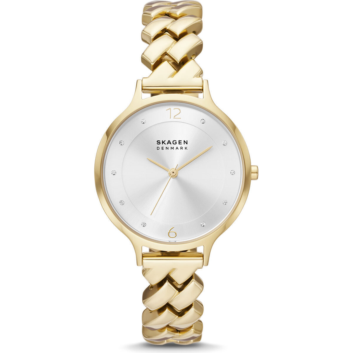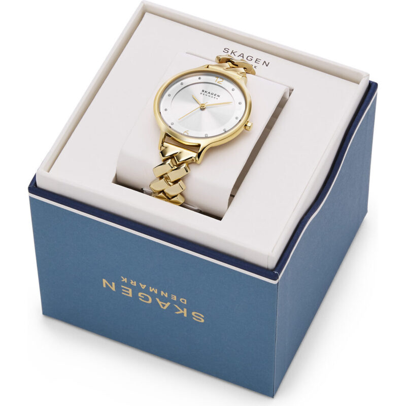 Experience the intersection of jewellery and horology with the Skagen Anita Limited Edition SKW3066. This 36mm timepiece features a polished yellow gold-tone case crafted from eco-conscious recycled steel and a breathtaking silver sunray dial accented by glitz markers for a subtle sparkle.The standout feature is the Copenhagen cobblestone link bracelet, which evokes a sophisticated jewellery look.Driven by a precise Japanese three-hand quartz movement, it is the quintessential accessory for the modern woman who values sustainable luxury and refined Danish design.