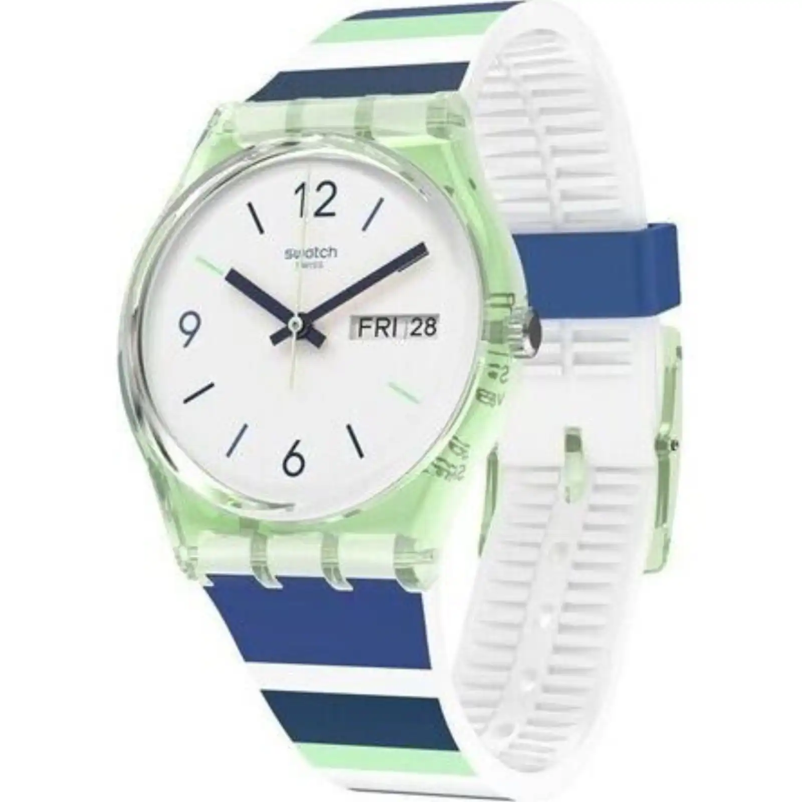 WR: 3 ATM – Case: 34 mm – Gender: Unisex – Case Material: Plastic – Strap Material: Silicone – Movement: Quartz – Functions: Day & Date – Glass: Plastic – Product Type: Wristwatch – Made in: Switzerland – Packaging: Official Box