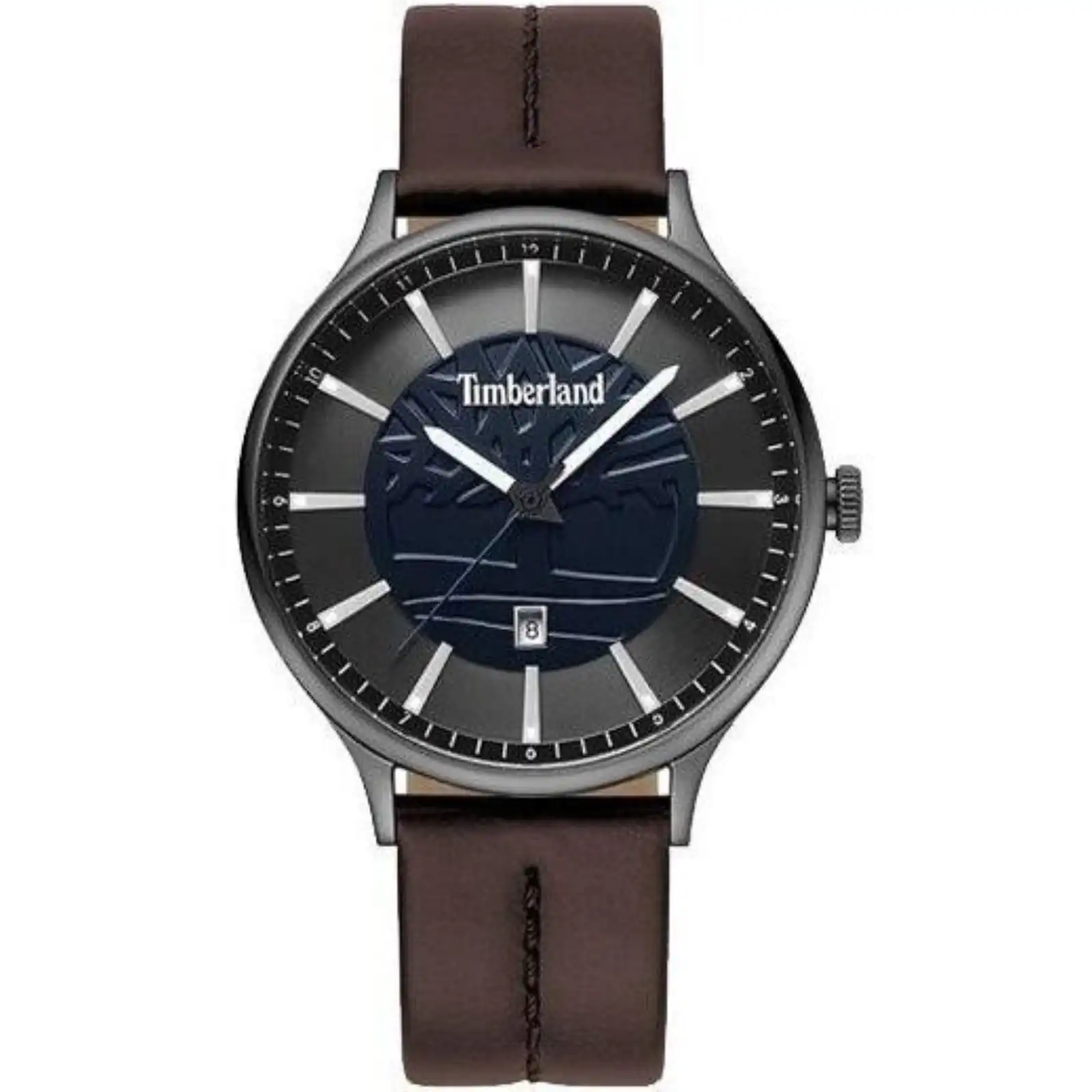 The strap is a testament to Timberland’s commitment to quality and sustainability. Crafted from genuine “Better Leather,” it is sourced from a tannery rated silver or higher for its exceptional environmental practices. This is not just any leather; it is soft and supple from the first wear, yet incredibly durable. It is designed to conform to the unique shape of your wrist over time, developing a rich and personal patina that tells the story of your journeys. The earthy brown colour and contrast off-white stitching provide a classic, rustic counterpoint to the cool, industrial feel of the case, creating a beautifully balanced and versatile aesthetic. It is secured by a sturdy gunmetal-toned pin-and-buckle clasp, engraved with the Timberland logo, ensuring your watch remains comfortably and securely on your wrist.