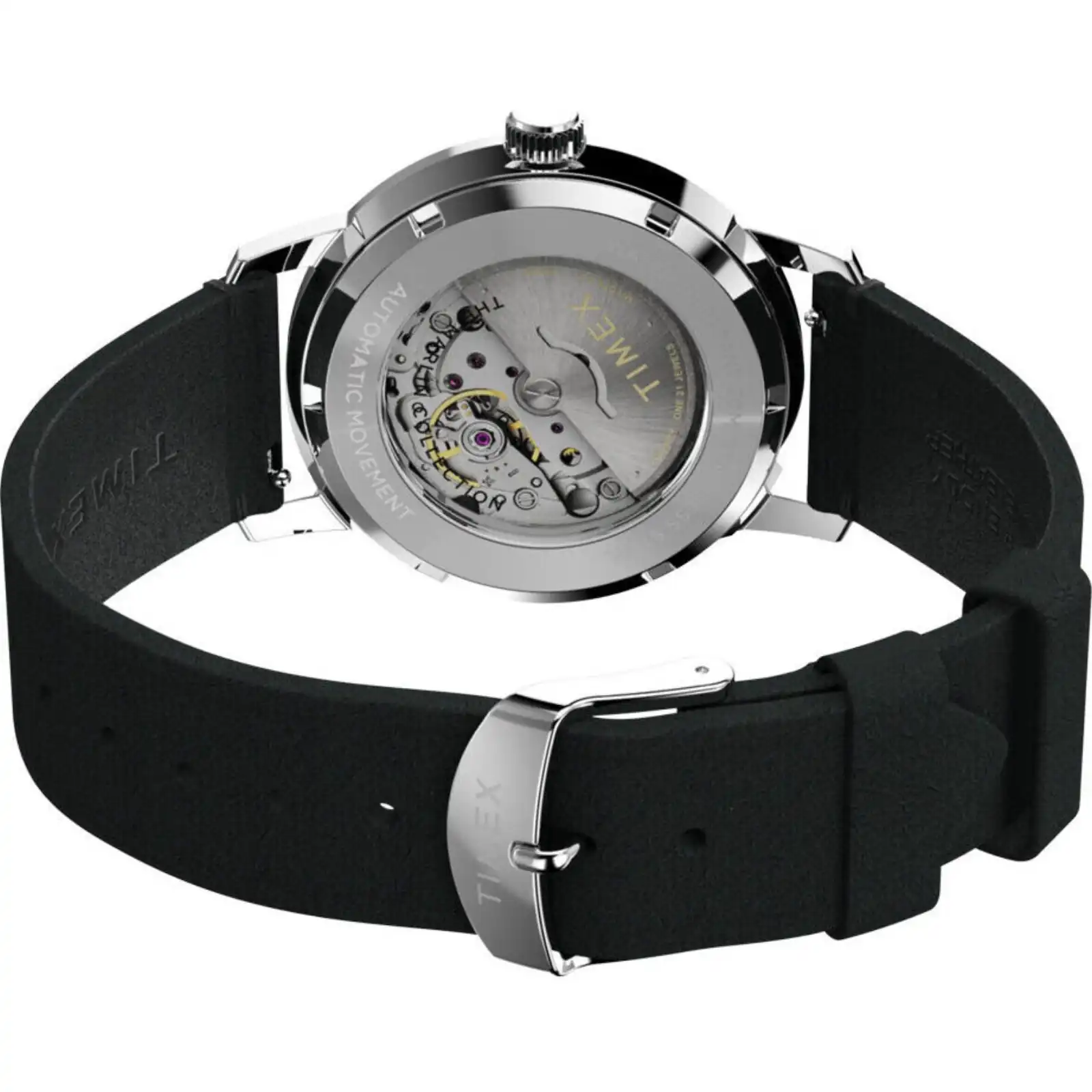 - Case: 40mm silver-tone stainless steel with an exhibition case back