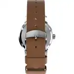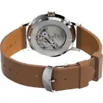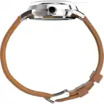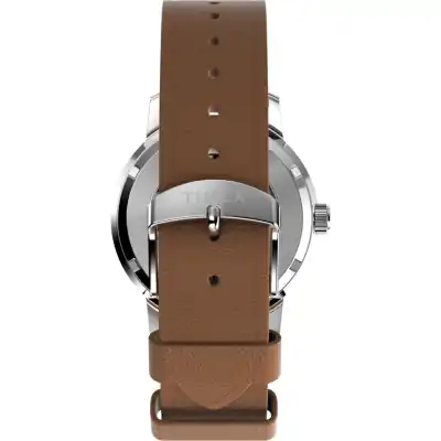 - Strap: Brown leather (approx. 20mm width) with a buckle closure