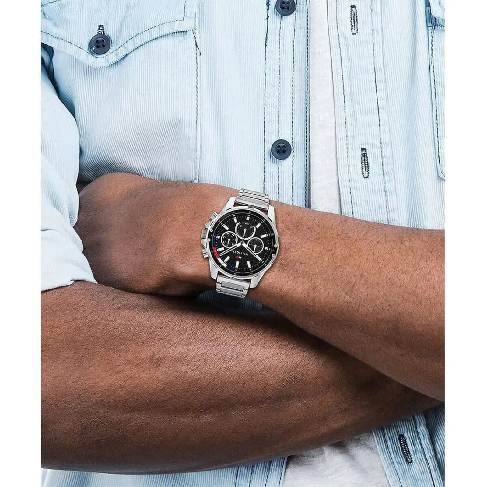 The Tommy Hilfiger Mason 1791936 is a high-impact 45mm timepiece that redefines the modern dress-sport watch. Combining the athletic silhouette of a multi-eye dial with a sophisticated silver-tone stainless steel finish, this watch embodies the “Classic American Cool” aesthetic through a lens of elevated luxury.