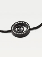 Our visual audit of the 2780525 reference confirms a masterclass in tonal contrast. The primary body of the bracelet is finished in a polished Ionic-Plated Black, a treatment that results in a liquid-like, ink-black surface. This dark backdrop serves to dramatically amplify the fire of the 28 clear crystals that are pavé-set around the central ring. These crystals are not merely glued; they are secured in micro-settings that allow light to enter from multiple angles, ensuring the bracelet “pops” even in low-light environments like a dinner in Sandton or an evening event in Cape Town. The snake chain construction provides a smooth, continuous shimmer that contrasts beautifully with the textured brilliance of the stone-set charm.