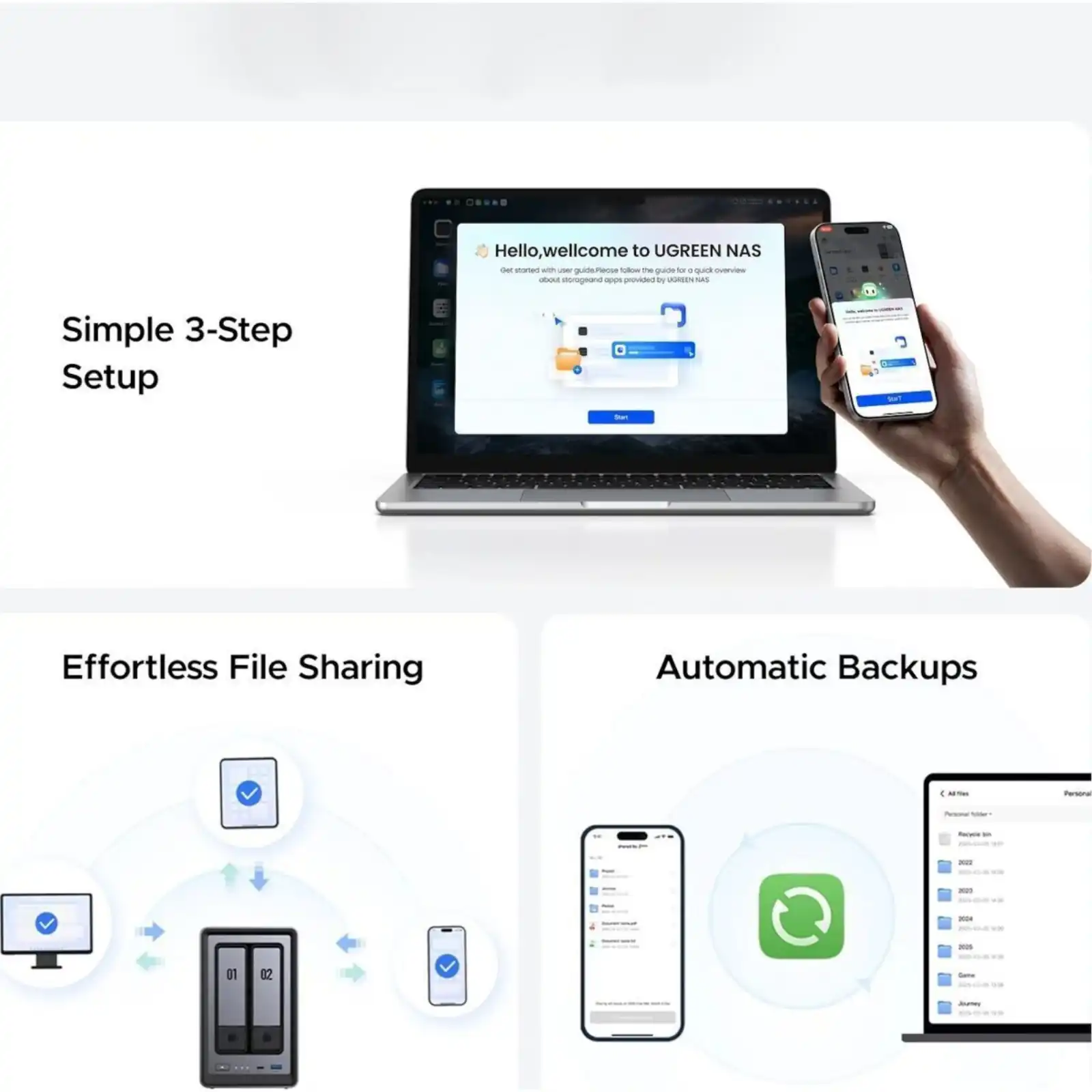 The high-speed LAN port (2.5GbE) enables ultra-fast data transfers, while front and rear USB ports simplify external backups and file imports. UGOS Pro, UGREEN’s user-friendly OS, supports cross-platform access and intuitive data management, ensuring your workflow remains uninterrupted, no matter the device or operating system.