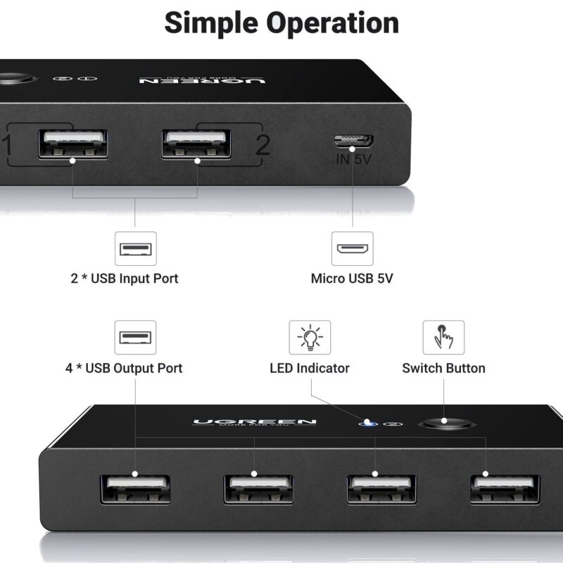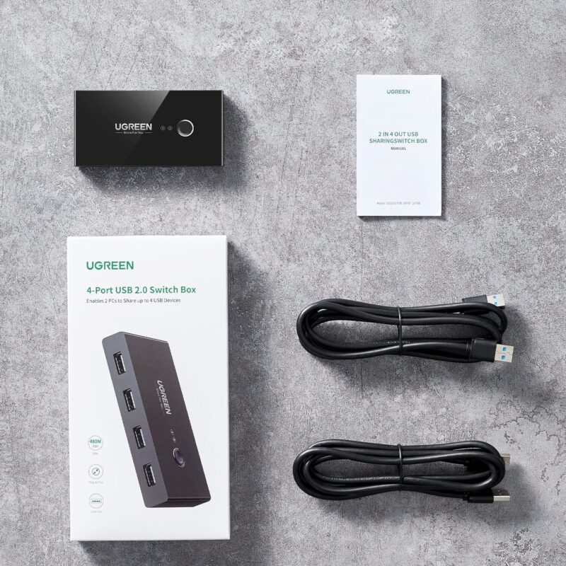 The UGREEN USB 3.0 4-Port Switch Box is a practical solution for seamlessly sharing multiple USB peripherals between two computers. This switch box allows up to two systems to access four USB devices—such as printers, scanners, keyboards, and external hard drives—without the need for constant unplugging and reconnecting.