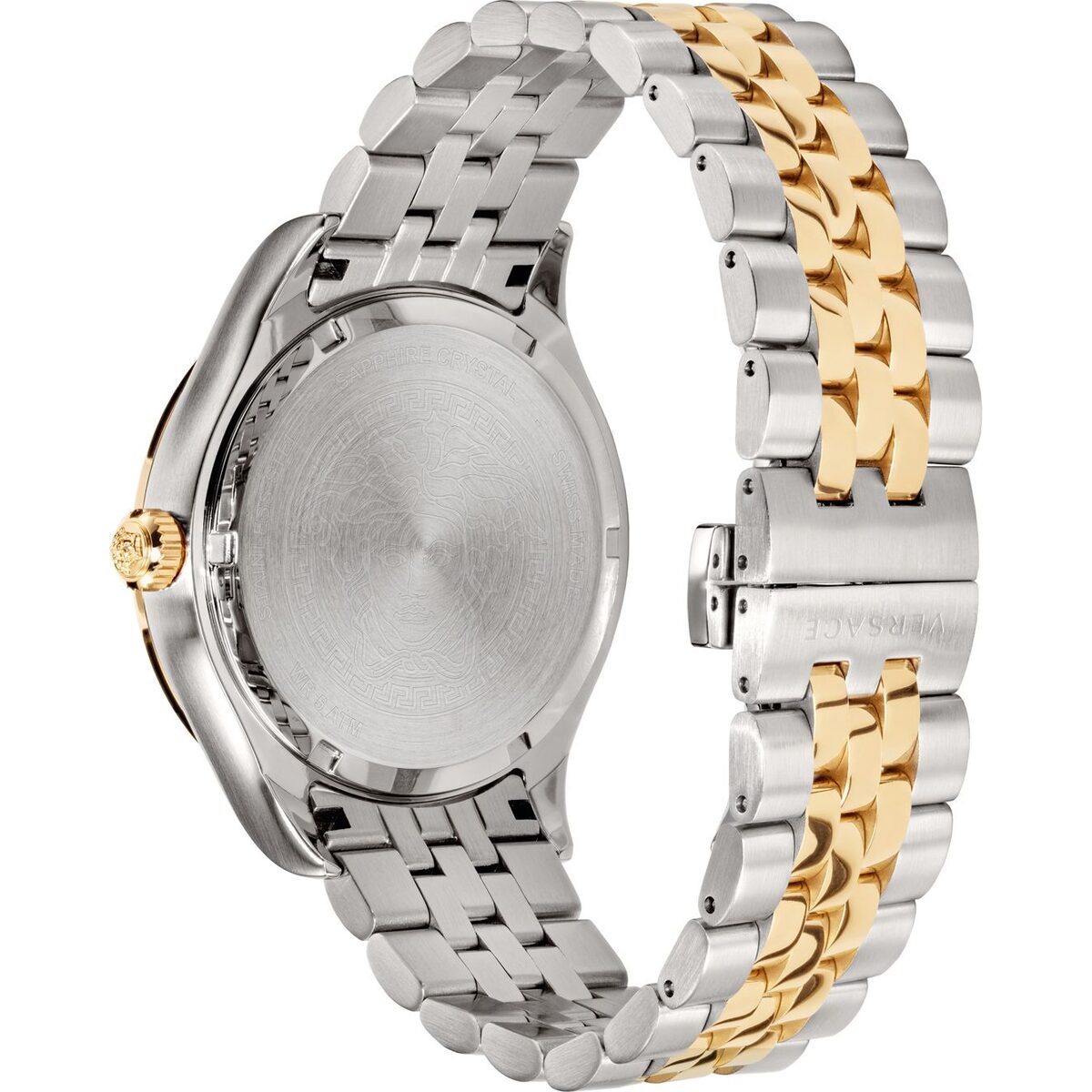 To maintain the lustre of the Versace Hellenyium VEVK00620, we recommend cleaning the two-tone bracelet with a soft, lint-free cloth after daily wear. The Ion Plating is highly durable, but avoid direct contact with harsh chemicals, strong perfumes, or abrasive surfaces to prevent premature wear of the gold-tone sections. While the watch is water-resistant to 50 metres, it is advisable to have the seals checked every two years to ensure continued protection. Store your timepiece in its original Versace presentation box to protect the sapphire crystal and the brushed finish from accidental impact.