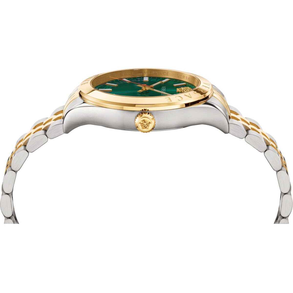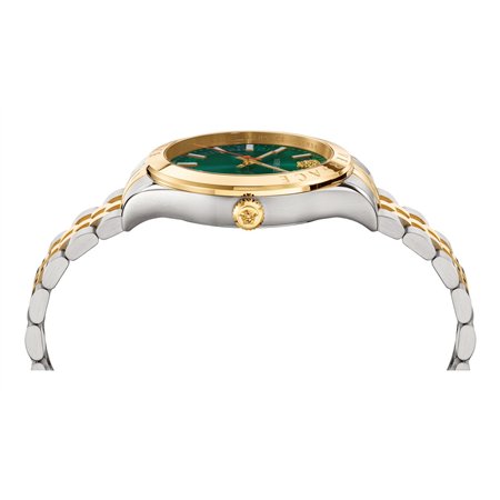 The Versace Hellenyium (VEVK00620) is a masterclass in horological design, taking inspiration from the architectural beauty of Ancient Greece and the high-fashion runways of Milan. This 42mm timepiece is defined by its striking green sunray dial and a sophisticated two-tone finish, offering a look that is both authoritative and refined. It is the definitive choice for the modern man who seeks a timepiece that serves as a bridge between a precision instrument and a luxury accessory.