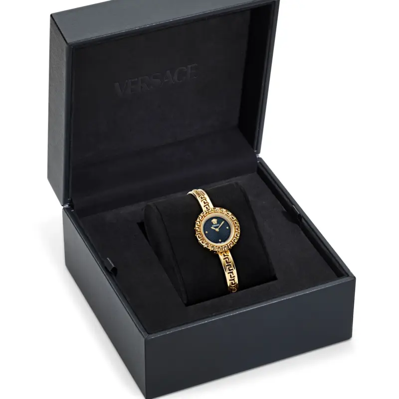 To ensure the lasting brilliance of your Versace La Greca VE8C00524, we recommend wiping the watch and its intricate Greca-link bracelet with a soft, lint-free cloth after every wear to remove skin oils and cosmetic residues. Due to the high-gloss IP gold finish and the presence of genuine diamonds, avoid exposing the watch to harsh chemicals, hand sanitizers, or perfumes, which can dull the surface over time. The sapphire crystal is exceptionally scratch-resistant, but the tubular case should be protected from direct impact against hard surfaces. For our South African clients, we recommend a professional battery replacement every 2 to 3 years at an authorized service center to ensure the Swiss movement and the 3 ATM water seals are properly maintained. Always store the watch in its original Versace presentation box to prevent the jewelry-style bracelet from tangling or scratching.
