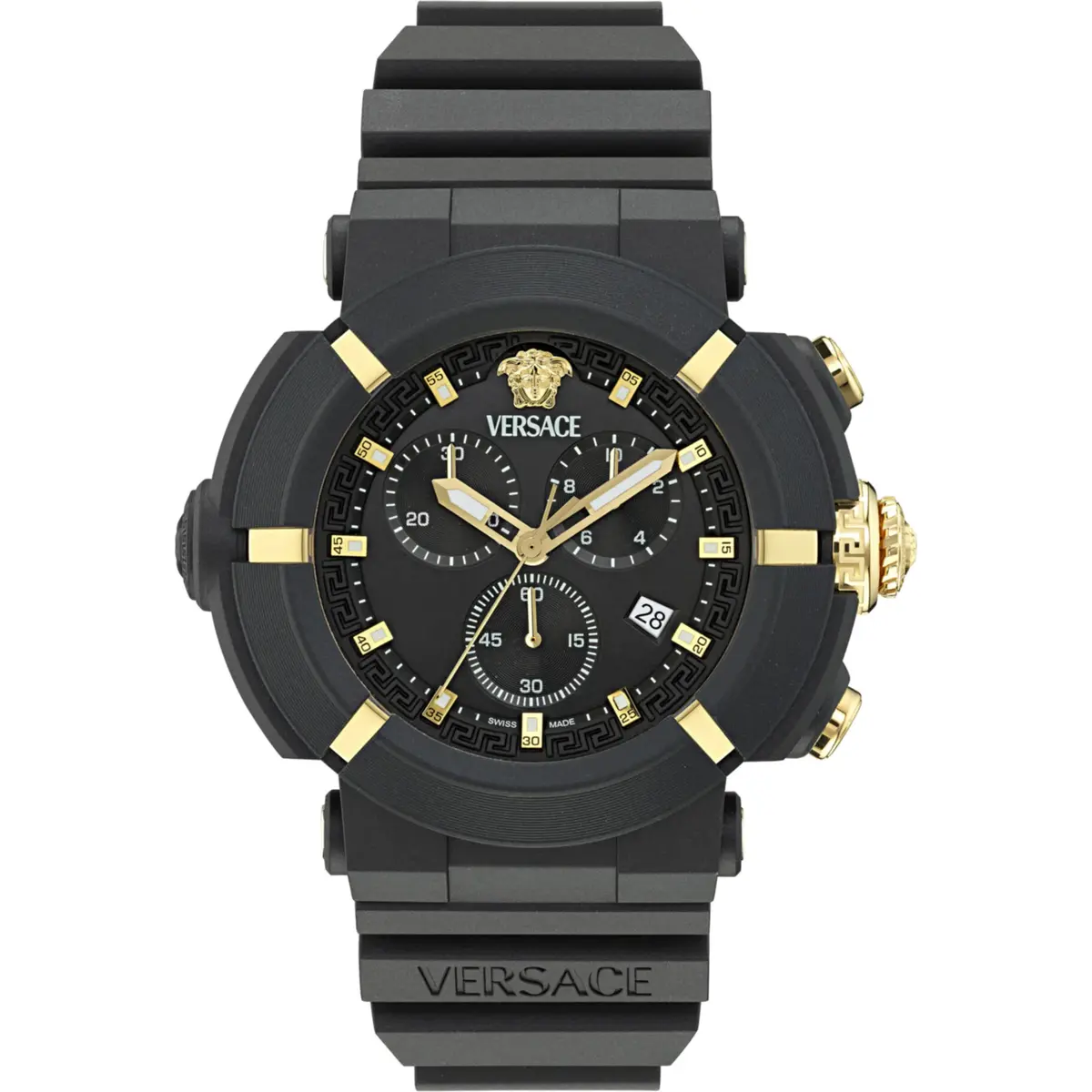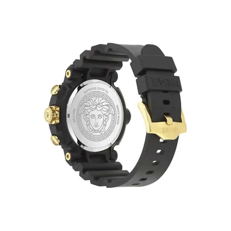 - High-Durability Silicone Strap: A sporty, soft-touch strap embossed with the Versace name, designed to withstand sweat and humidity.