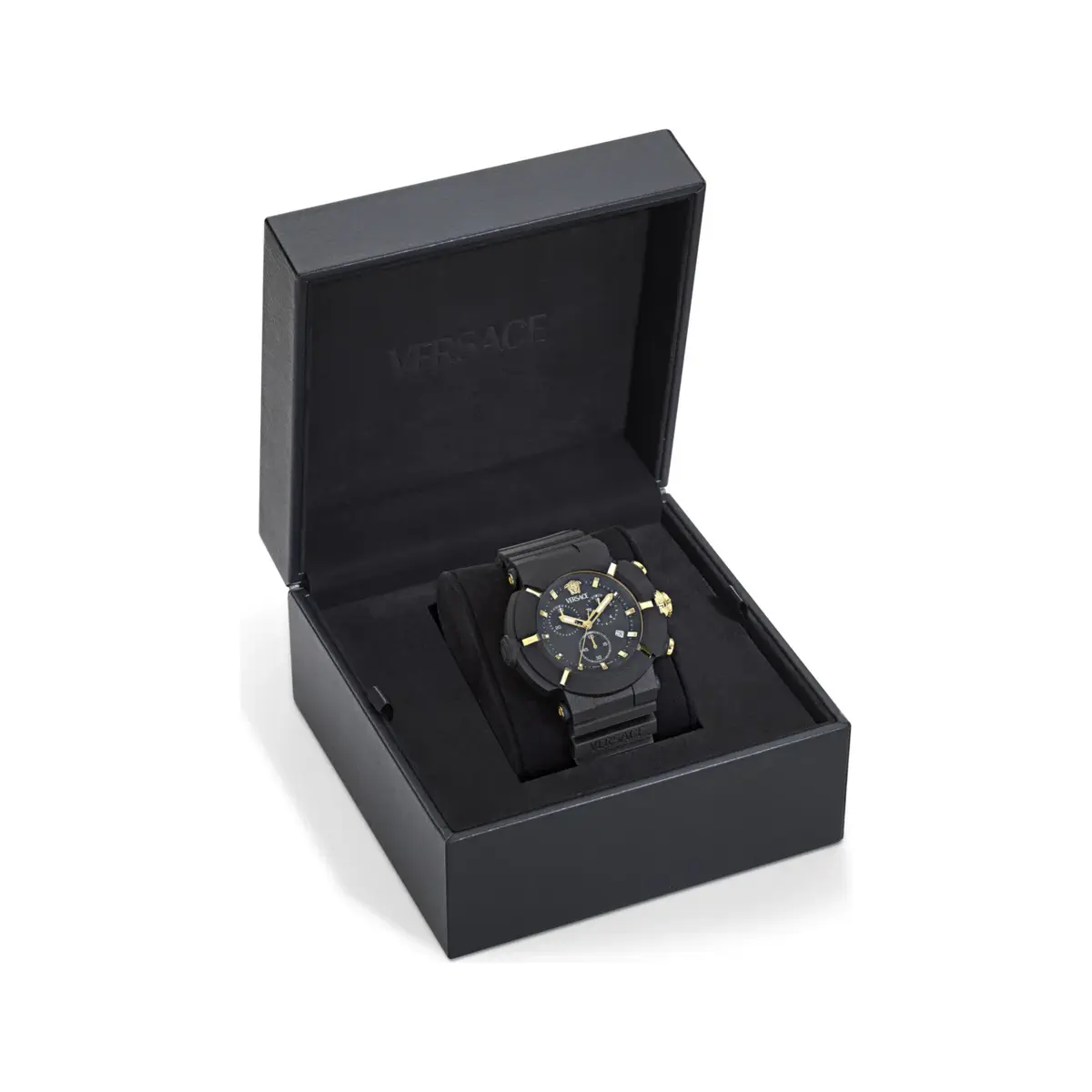 - Gold-Tone Medusa Iconography: Features the iconic 3D Medusa and Versace logo at 12 o’clock, creating a luxurious focal point on the matte black dial.