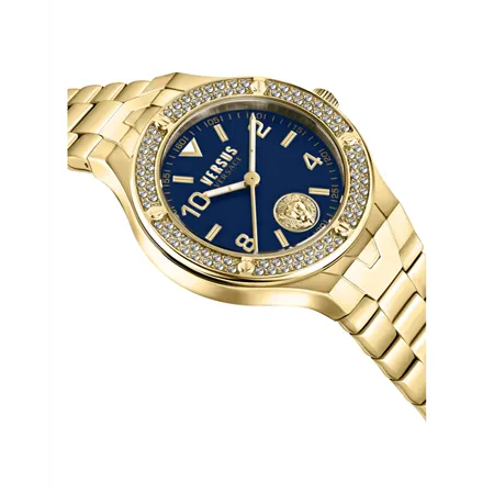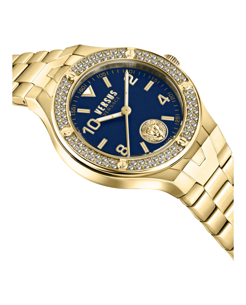 - Royal Blue Enamel Dial: A rich, textured dial featuring the repeating “Versus” logo pattern for a sophisticated and dimensional look.