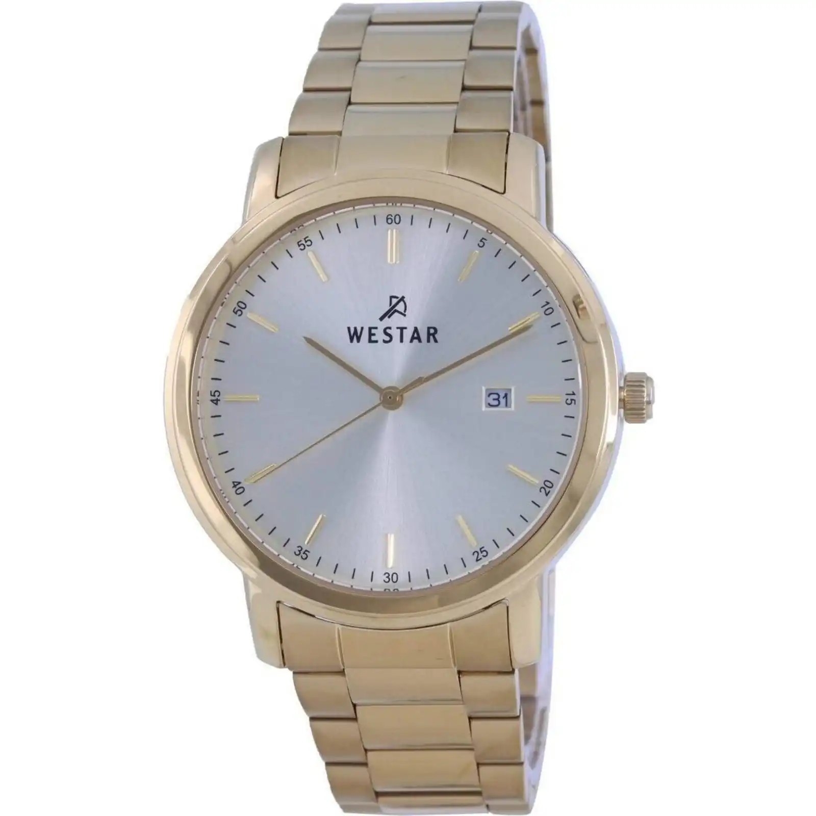 Gold Tone Stainless Steel Case Gold Tone Stainless Steel Bracelet Quartz Movement Mineral Crystal Silver Dial Analog Display Date Display Solid Case Back Deployment Clasp 50m Water Resistance