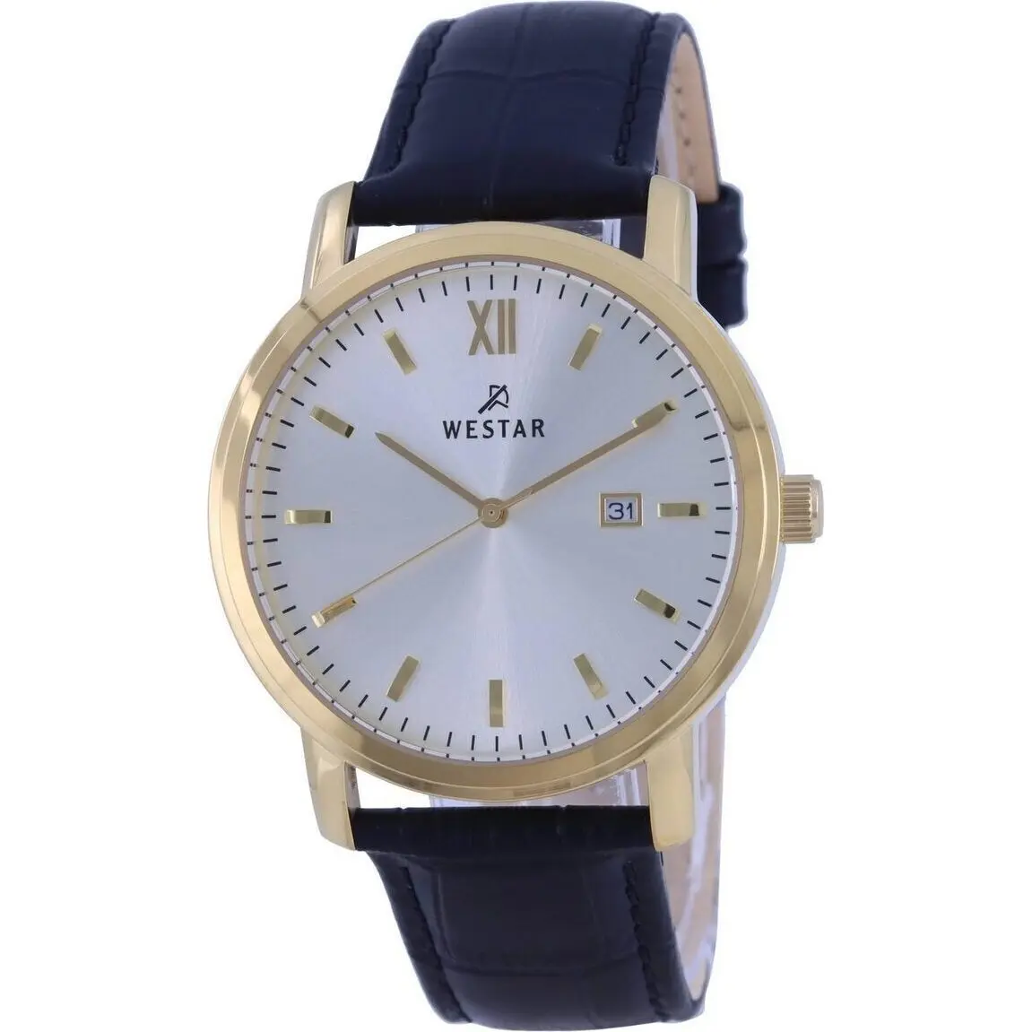 Gold Tone Stainless Steel Case Leather Strap Quartz Movement Mineral Crystal Silver Dial Analog Display Date Display Solid Case Back Buckle Clasp 50m Water Resistance