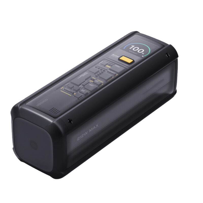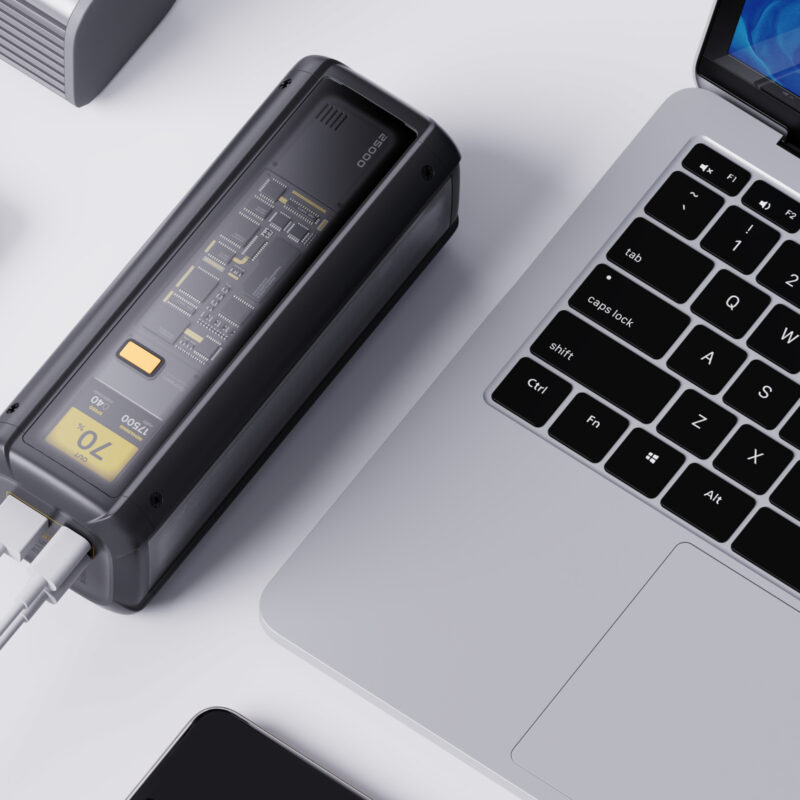 Beyond its formidable performance, this power bank is crafted with a distinctive aesthetic and robust build quality. The three-sided transparent design reveals a sophisticated interior, showcasing its advanced components with a geek-chic appeal. The angular yet smooth, rounded shell offers a comfortable and secure grip, designed for both durability and ergonomic comfort. This sleek design embodies a hardcore tech aesthetic, reflecting the advanced technology within, making it more than just a portable charger; it’s a statement.