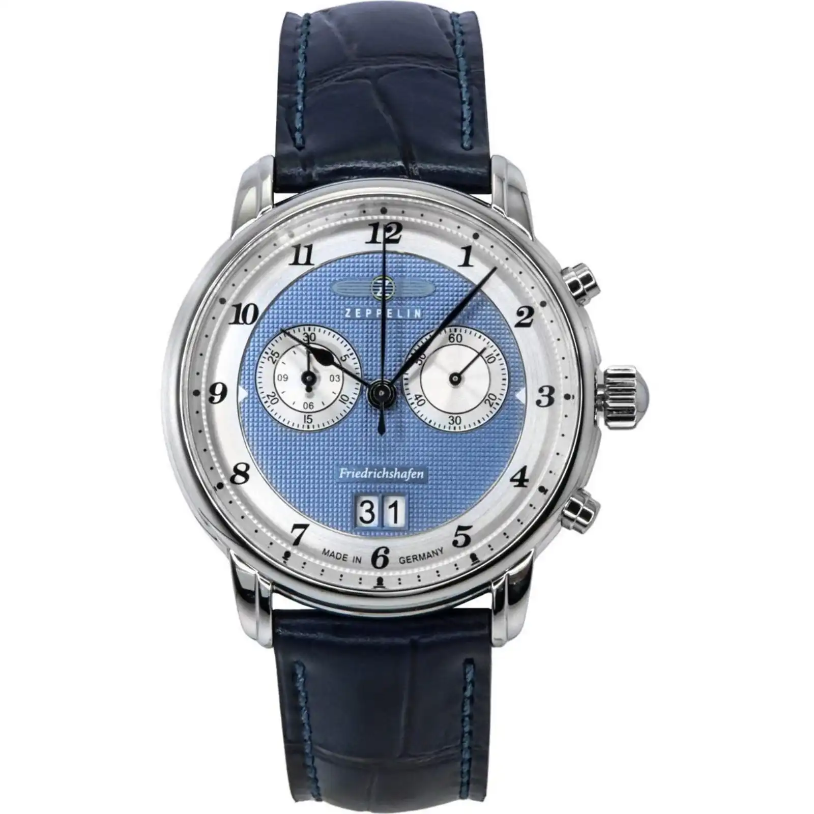 Stainless Steel Case Leather Strap Quartz Movement Caliber: Ronda 5020.B 5 Jewels K1 Safety Mineral Crystal Blue Dial Analog Display Chronograph Function Date Display Screwed Case Back Buckle Clasp 50M Water Resistance